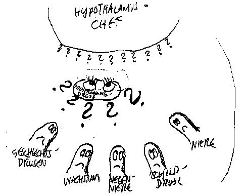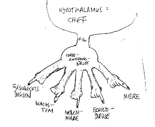 Das Zentrum der Hormonsysteme im Kopf, der Chef sozusagen, heißt Hypothalamus“. Dieser befiehlt mit Befehlshormonen seinem Stellvertreter, der Hirnanhangdrüse. Die Hirnanhangdrüse steuert streng nach den Befehlen des Chefs die Funktion weiterer Hormonsysteme im Körper draußen durch Steuerhormone.
