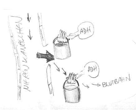 | Abb.2 soll euch die Trägerfunktion des ADH für Wasser verdeutlichen. ADH holt freies Wasser aus den Nierenkanälchen zurück in die Blutbahn. | ![]() |